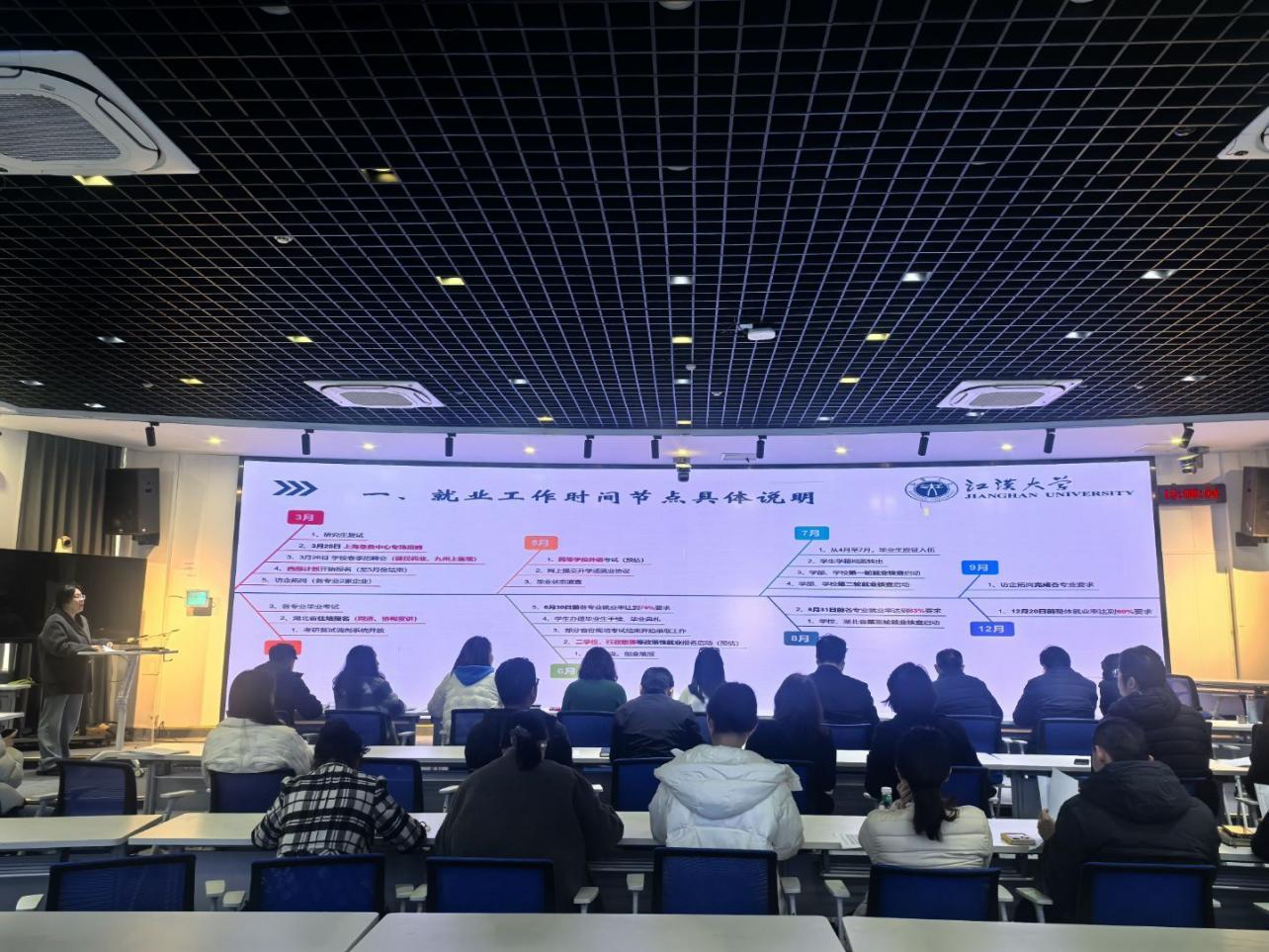 会上,辅导员胡冰老师解读就业工作具体安排,梳理了就业工作整体进度、关键时间节点和学校工作要求,介绍了近期招聘会信息、用人单位需求,宣讲了基层就业、升学深造、应征入伍、自主创业等多元就业路径的相关政策。